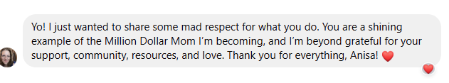 I’m Anisa Crespo, Co-Founder of Million Dollar Mom Society. After being in a male dominated industry for over 10 years I had a spiritual awakening and realized my true calling is helping women, so I left my 6 figure corporate job and that is what I do now! As a coach I help mompreneurs scale their businesses so they can carry out their missions and live a prosperous and fulfilling life! I'm also a real estate investor, podcast host, published author, public speaker, on the Board of Directors for a nonprofit, Global Women of Impact, but my two main roles are child of God and mother of toddler twins. I bet everything on myself and my business to be home with my kids and now my business partner and I are showing women how they can do the same!